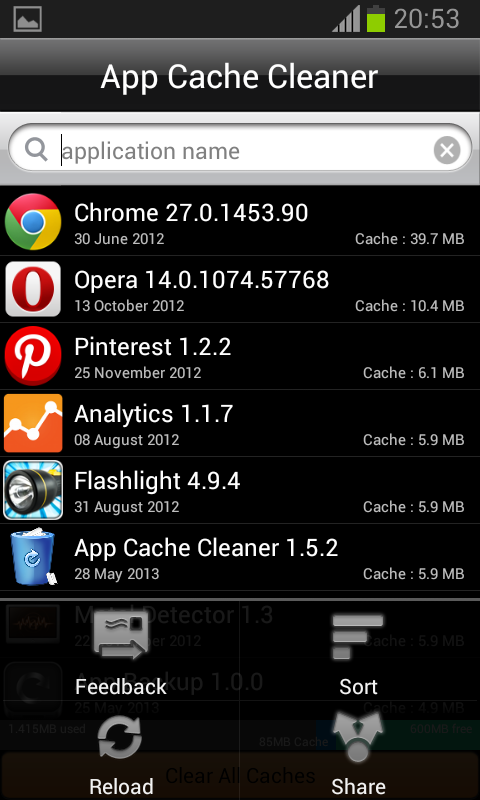 - List applications' and cache size's,