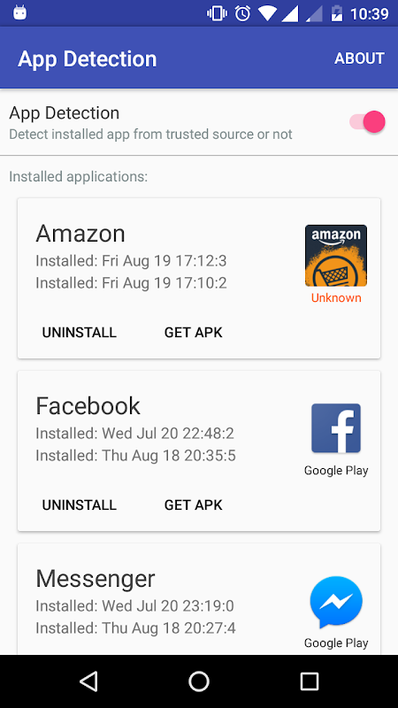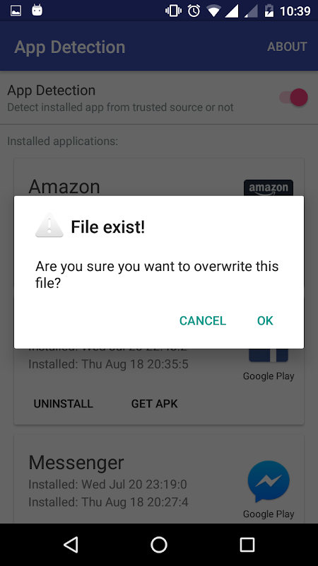App Detection is an application that detect new installed application. Then automatically check whether it is from trusted store or not.