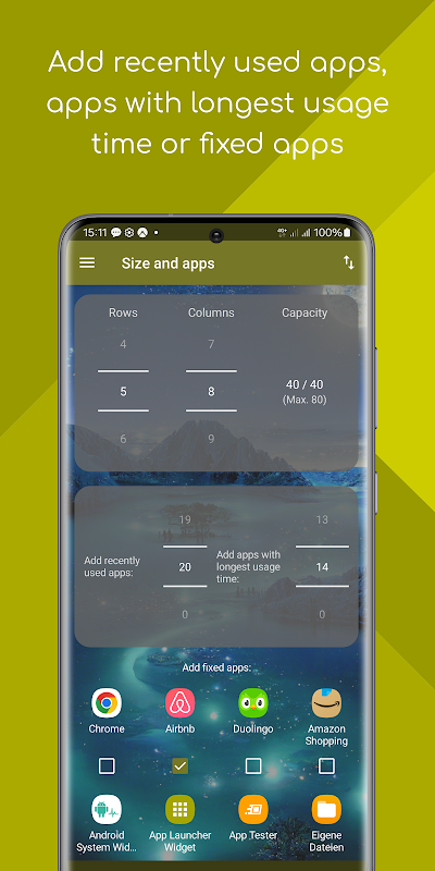 จำนวนแอปบนวิดเจ็ตสามารถปรับได้โดยการเลือกจำนวนแถวและคอลัมน์ที่เหมาะสม แม้ว่าเครื่องเรียกใช้งานแอปเริ่มต้นมักจะจำกัดไว้สูงสุด 5 แอปติดต่อกัน แต่วิดเจ็ตเครื่องเรียกใช้งานแอปให้ความยืดหยุ่นมากกว่า ดังนั้นคุณสามารถเช่น วางแอป 5 x 8 = 40 แอปในพื้นที่เดียวกับที่ตัวเรียกใช้งานปกติรองรับแอปได้สูงสุด 2 x 5 = 10 แอป