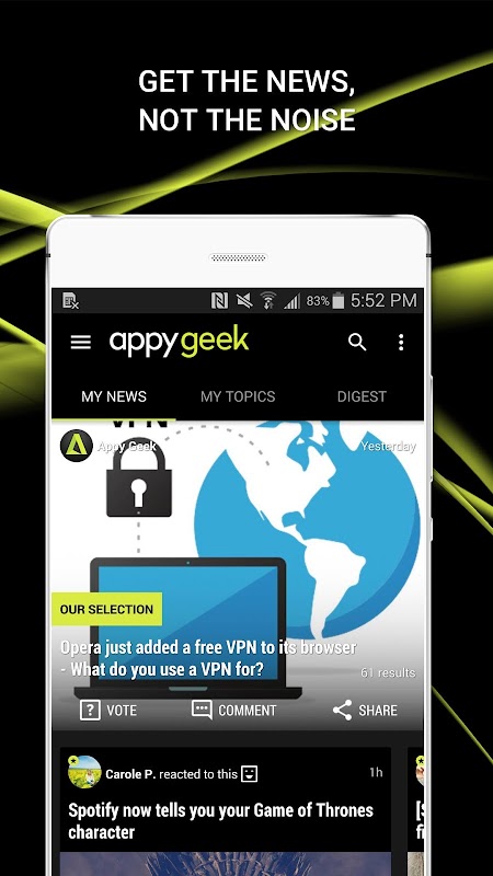 • Smart: Appy Geek learns as you read, personalizing your news experience automatically.
