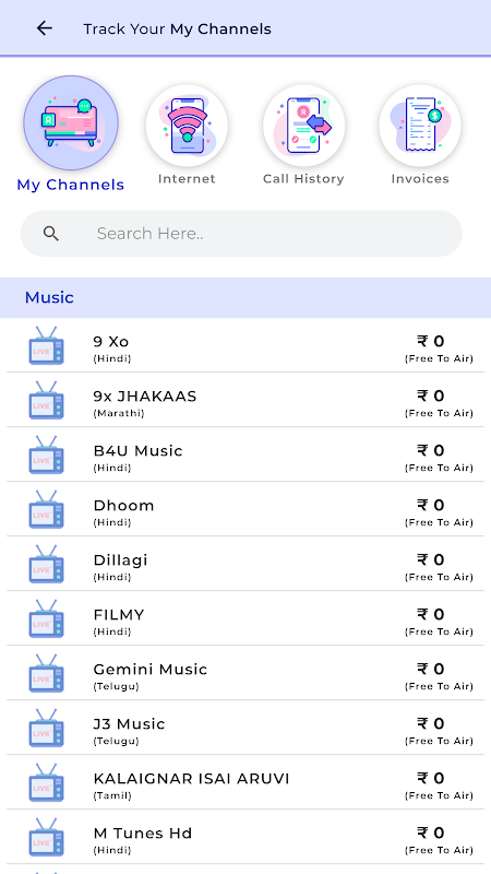 - Channel List to view their existing channels and subscriber can purchase new channels.