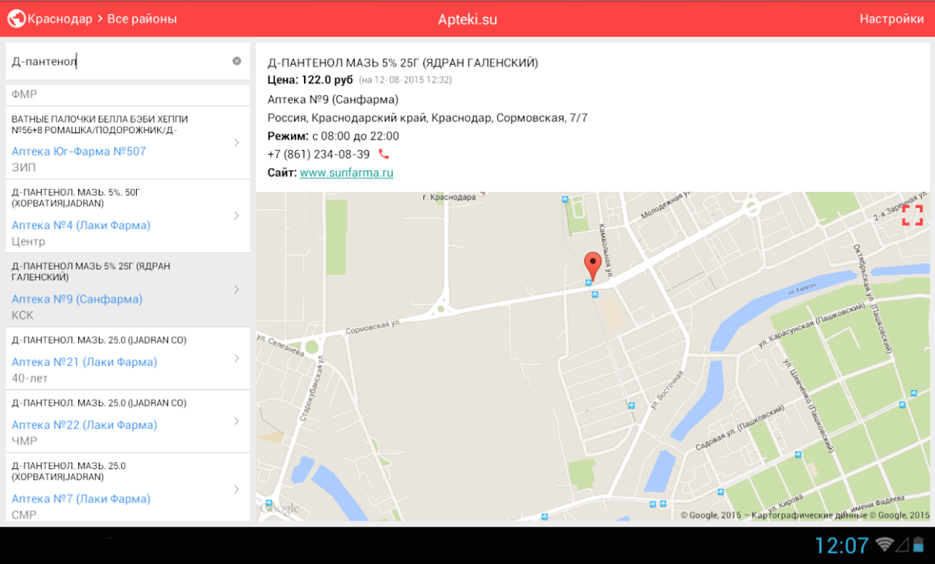 - пользователю предоставляется исчерпывающая информация по каждой аптеке (название аптеки и сети, адрес и месторасположение на карте, график работы, дата и время обновления товаров в базе, контактные телефоны с функцией быстрого набора номера из приложения, информация о скидках и акциях, возможности заказа и доставки);