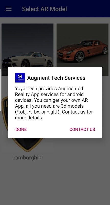 Yaya Tech provides Augmented Reality App services for android devices. You can get your own AR App, all you need are 3D Models (.obj, .fbx, or .gltf). Contact us for more details.