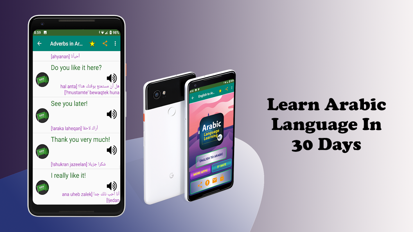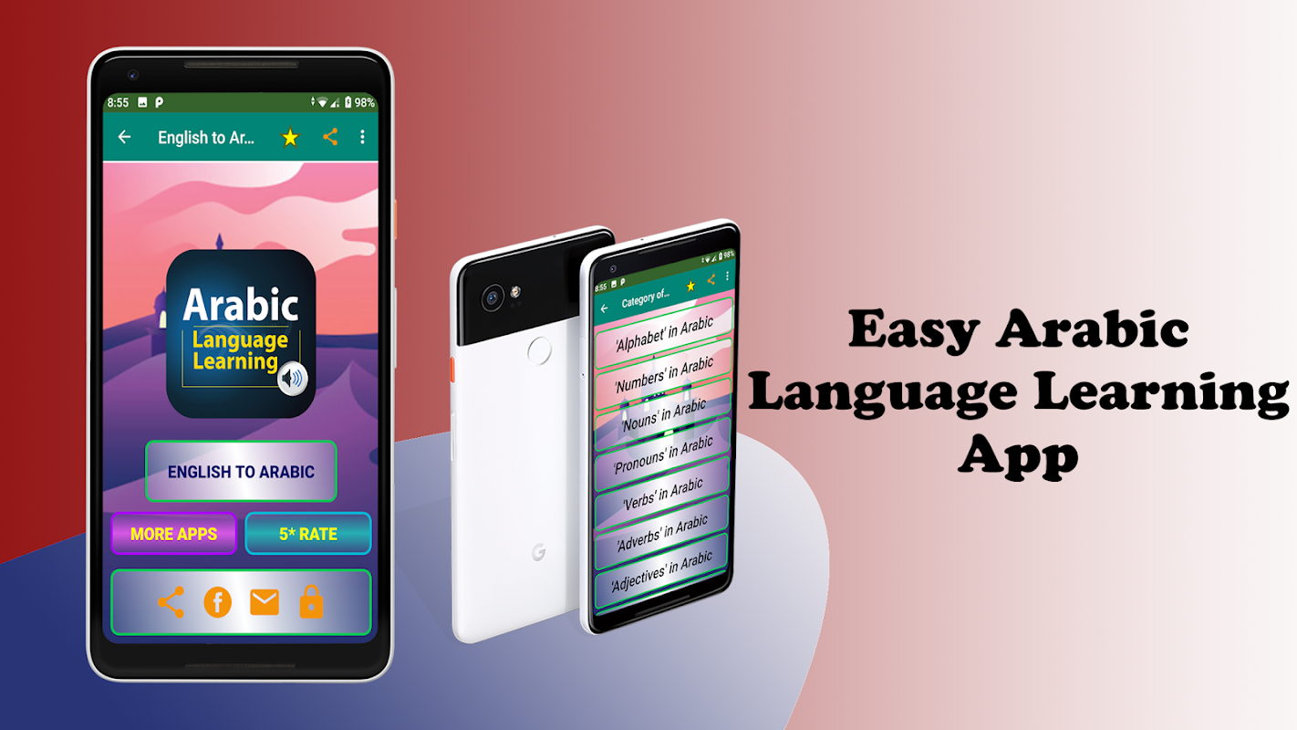 เรียนภาษาอาหรับเป็นภาษาอังกฤษเป็นแอปพลิเคชันประเภทที่ง่ายมากซึ่งฟรีสำหรับแอปเริ่มต้นการเรียนรู้ภาษาอาหรับฟรี นอกจากนี้ยังเป็นการเรียนรู้ภาษาอาหรับฟรีและอ่านได้ง่ายด้วยเสียงและการออกเสียงที่แท้จริงของแอปการเรียนรู้ภาษาอาหรับเกือบหนังสือเรียนภาษาอาหรับฟรีสำหรับทุกคน