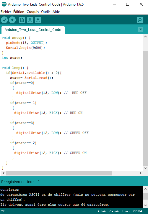 You must know that by clicking on 'RED_ON' the application send '1' and '0' when clicking on 'RED_OFF' and by clicking on 'GREEN_ON' the application send '3' and '2' when clicking on 'RED_OFF' which means that you'll have to program