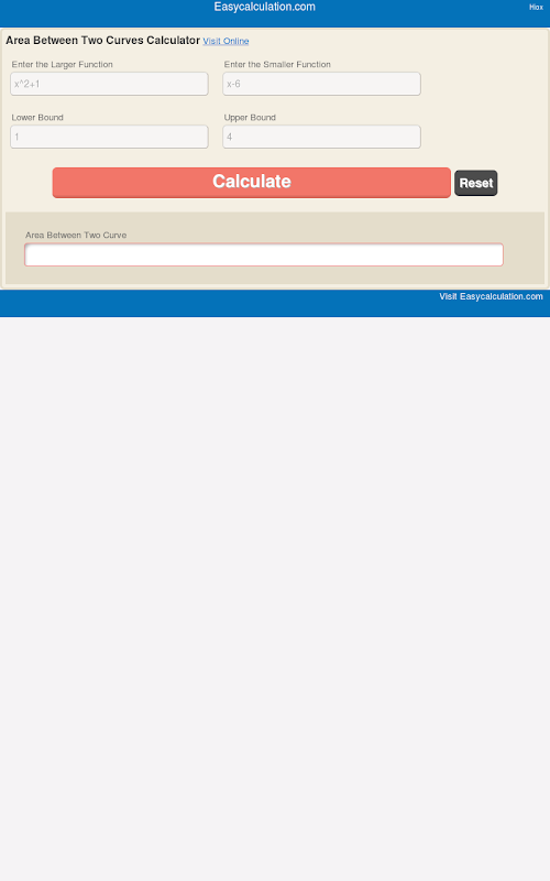 The area between curves calculator uses inputs such as larger function, smaller function, upper bound and lower bound to estimate curve area.