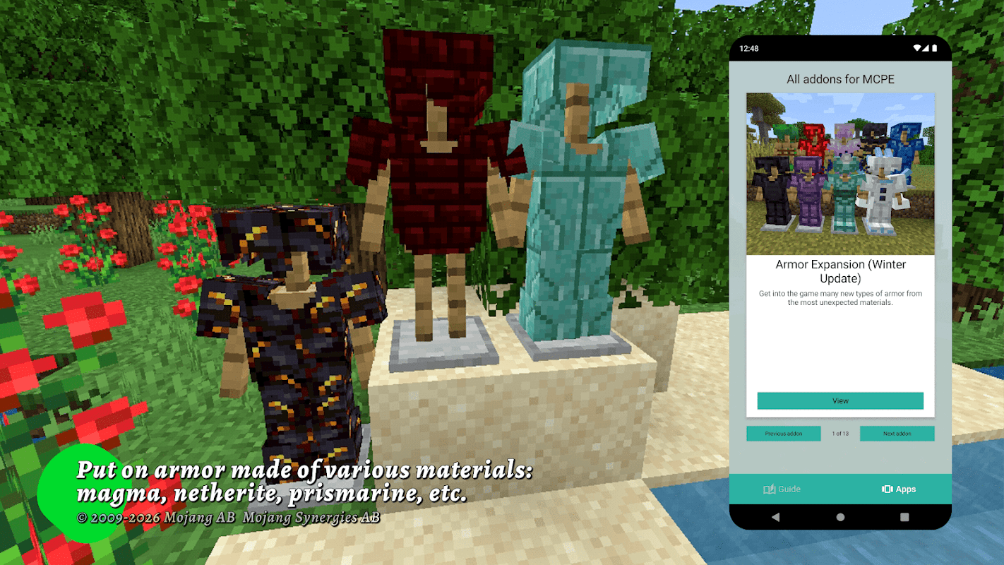 ข้อจำกัดความรับผิดชอบ: นี่เป็นแอปพลิเคชั่นที่ไม่เป็นทางการที่มีส่วนเสริมของเกม ส่วนเสริมเหล่านี้ที่มีอยู่ในแอปพลิเคชันไม่มีส่วนเกี่ยวข้องกับเจ้าของเครื่องหมายการค้า Mojang AB ชื่อ แบรนด์ และทรัพย์สินเป็นทรัพย์สินของเจ้าของและได้รับการคุ้มครองตามหลักเกณฑ์