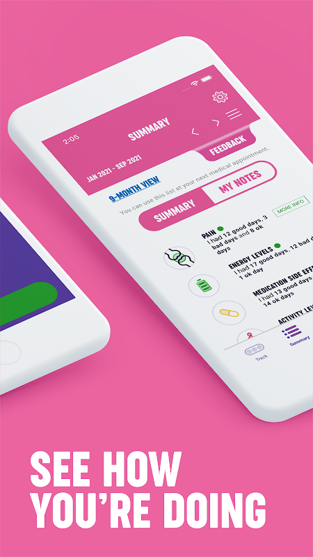 เครื่องมือนี้ให้ข้อมูลสรุปง่ายๆ เกี่ยวกับอาการปวด อาการปวดข้อ ผลข้างเคียงของยา ระดับพลังงาน กิจกรรม การนอนหลับ และอารมณ์ ซึ่งคุณสามารถใช้เพื่อพูดคุยถึงอาการของคุณกับผู้เชี่ยวชาญด้านสุขภาพในระหว่างการนัดหมาย หรือเพื่อดูอาการของคุณในช่วงที่ผ่านมา