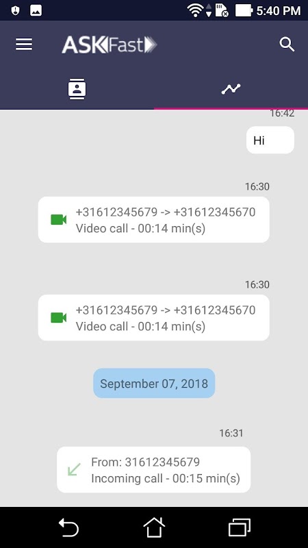 • VOIP CALLING: ASK-Fast uses your internet connection to call with your contacts. If your contact doesn't have the ASK-Fast application you can set up a call in the application.
