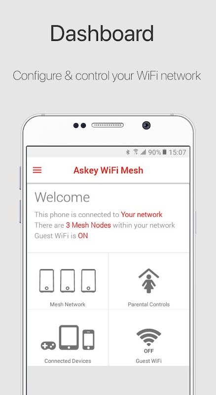 คู่หูที่สมบูรณ์แบบของโซลูชั่น Askey WiFi ตาข่าย Askey WiFi ตาข่าย App ช่วยให้คุณควบคุมทั้งหมดของเครือข่ายไร้สายในบ้านของคุณ ขอขอบคุณที่ App นี้คุณจะได้รับรู้และจัดการทุกอย่างสวยมากเกี่ยวกับเครือข่ายไร้สายของคุณ ชื่ออุปกรณ์ไร้สายของคุณและวางไว้ในห้องที่แตกต่างกัน ได้อย่างง่ายดายเลือกชื่อเครือข่ายไร้สายของคุณและรหัสผ่าน ตรวจสอบความเร็วในการเชื่อมต่อ สร้างข้อมูลประจำตัวพิเศษและให้เข้าถึงผู้เข้าชม กําหนดการควบคุมโดยผู้ปกครองและกำหนดการเปิด / ปิดการเชื่อมต่อ WiFi ครั้ง ให้กับเครือข่ายหลักของคุณเป็นส่วนตัวและปลอดภัย - คุณก็สามารถเปิด App เพื่อดูว่ามีใครที่เชื่อมต่อกับเครือข่ายของคุณและให้หรือปฏิเสธการเข้าถึงในไม่กี่ก๊อก ติดตั้งกำหนดค่าและการตรวจสอบเครือข่ายไร้สายของคุณไม่เคยง่ายดังนั้น