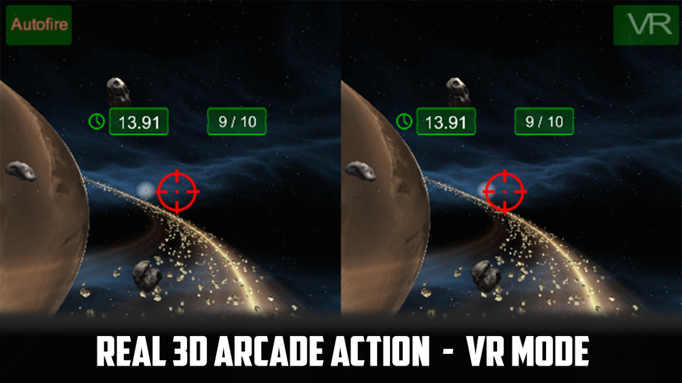 The graphics in this game are really good. I like the way that there is an option to either auto fire or use the button to fire. A few recommendations would be to only have the targeting reticle in one eye because it is hard to make it properly converge with both eye, make the image fully stretch to the edges of the screen and allow the trigger shoot option "stick" It always defaults to auto fire mode. I have a lot of fun just watching the asteroids float around without shooting them, the 3D effect is quite amazing!