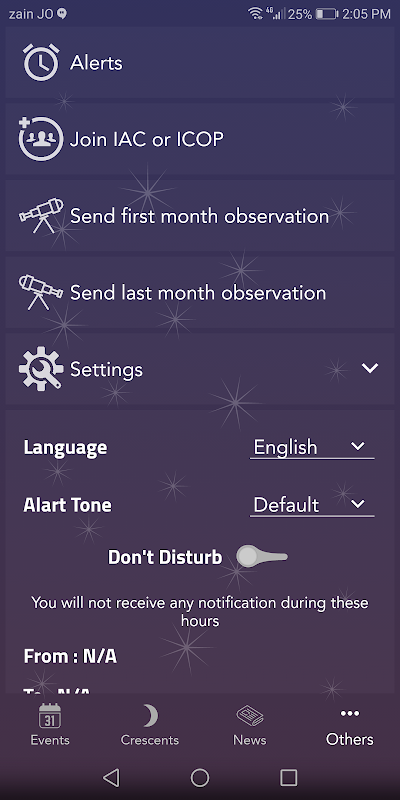 ไม่พลาดเหตุการณ์ทางดาราศาสตร์! เหตุการณ์ดาราศาสตร์ไม่เพียงรายการเหตุการณ์ทางดาราศาสตร์ที่สำคัญ แต่ก็ยังส่งการแจ้งเตือนจะแจ้งให้ทราบเกี่ยวกับเหตุการณ์ปัจจุบัน ผู้ได้รับรายละเอียดเบื้องต้นเกี่ยวกับเหตุการณ์แต่ละครั้งหนึ่งเหตุการณ์ที่เกิดขึ้นมีการคลิก นอกจากนี้โปรแกรมประยุกต์ที่มีเมนูข่าวในที่ที่คุณสามารถค้นหาบางข่าวดาราศาสตร์ที่สำคัญ นอกจากนี้คุณจะได้รับการแจ้งเตือนผลักดันสำหรับข่าวที่สำคัญเช่นการมองเห็นจันทร์เสี้ยวในบางประเทศ นอกจากนี้โปรแกรมประยุกต์ที่มีแท็บสำหรับเสี้ยวเล็งซึ่งผู้ใช้สามารถดูการคาดการณ์เสี้ยวเล็งสำหรับปีปัจจุบันและยังสามารถอ่านผลเสี้ยวสังเกตของเดือนก่อนหน้านี้ เหตุการณ์ที่เกิดขึ้นที่นี้รายการใบสมัครและส่งการแจ้งเตือนผลักดันให้มีดังนี้: -