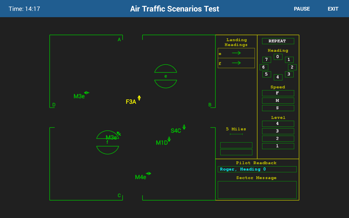 •ทดสอบสถานการณ์การจราจรทางอากาศ: นี่คือการจำลองเรดาร์ ATC ที่ปรับปรุงในสไลด์โชว์เคลื่อนไหวทุก ๆ เจ็ดวินาที ผู้เข้าร่วมจะได้รับมอบหมายให้ควบคุมเหนือภาคน่านฟ้ากับงานด้านการจัดการการจราจรขาเข้าอย่างปลอดภัยอย่างรวดเร็วและมีประสิทธิภาพที่สุดเท่าที่ทำได้