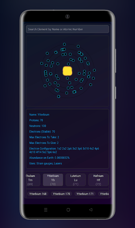 ข้อมูลองค์ประกอบโดยละเอียด: รับข้อมูลที่ครอบคลุมเกี่ยวกับแต่ละองค์ประกอบ รวมถึงชื่อ สัญลักษณ์ เลขอะตอม การจัดเรียงอิเล็กตรอน ความอุดมสมบูรณ์ และการใช้งาน
