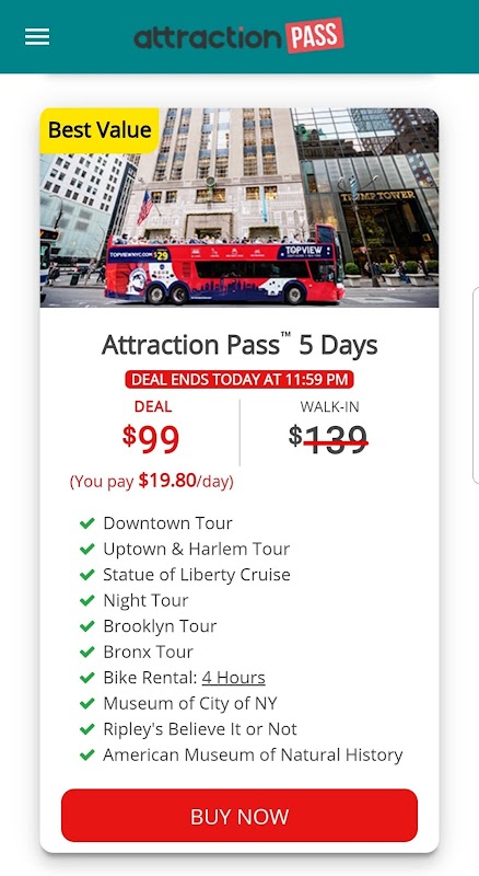 ที่ Attraction Pass®ภารกิจของเราคือการจัดทำกิจกรรมการเที่ยวชมสถานที่ที่ดีที่สุดและช่วยสร้างประสบการณ์ที่ไม่อาจลืมเลือนสำหรับผู้เยี่ยมชม NYC Attraction Pass®เปิดตัวในเดือนธันวาคม 2559 ต้อนรับนักท่องเที่ยวหลายล้านคนทั่วโลก