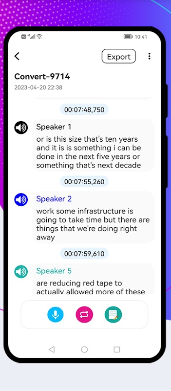EaseText Audio to Text Converter สำหรับ Android ได้รับการออกแบบให้ใช้ปัญญาประดิษฐ์เพื่อให้การถอดเสียงที่แม่นยำและเรียลไทม์ ถ่ายทอดการประชุม การสัมภาษณ์ การบรรยาย และการสนทนาด้วยเสียงทั้งหมดของคุณแบบเรียลไทม์ นอกจากนี้ยังรับประกันความเป็นส่วนตัวและความปลอดภัยของคุณด้วยการดำเนินการถอดเสียงแบบออฟไลน์บนอุปกรณ์ Android ของคุณ ด้วยคุณสมบัติการปรับแต่ง แอปสามารถถอดเสียงผู้พูดหลายคน สร้างสรุปการประชุม และรองรับภาษาต่างๆ มากถึง 24 ภาษา ได้แก่ อังกฤษ สเปน ดัตช์ และจีน คุณสามารถบันทึกไฟล์ถอดความในรูปแบบ TXT, WORD, HTML หรือ PDF