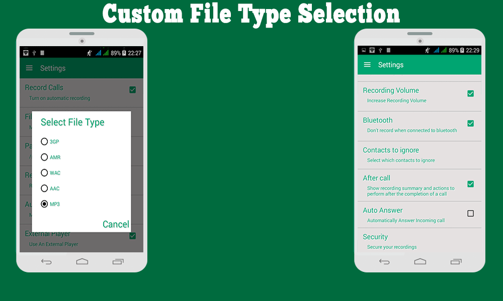 >>>Which type of call recording you want to save(MP3,AAC, 3GP etc)