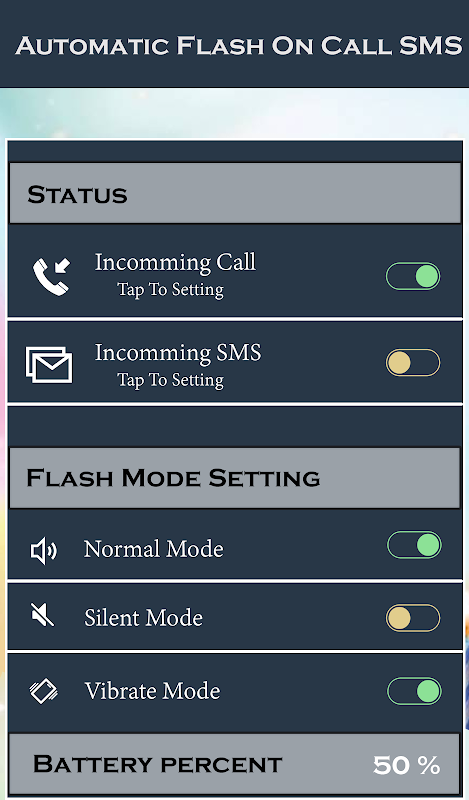 - You can turn on or turn off app by manual over device status sound mode as Ring, Vibrate or Silent mode With the flash sms alert customization option, sms alerts and customization option of duration of flash alert makes the Flash Alerts - Call and SMS easy and comfortable to use and operate.