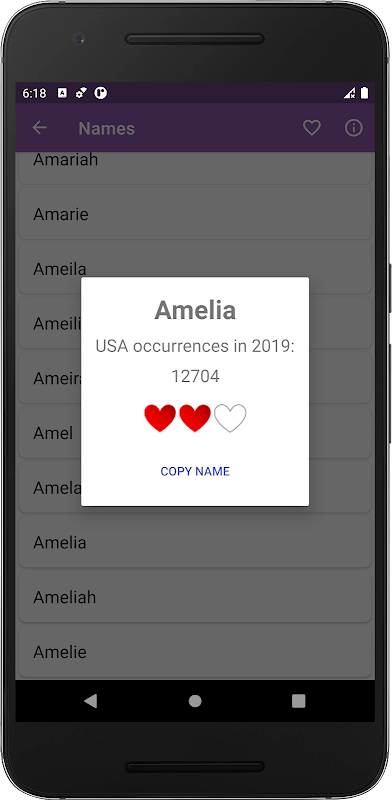 app สร้างชื่อทารกไปได้จากไฟล์ที่มีมากกว่า 20000 เด็กชายและเด็กหญิงชื่อ ชื่อทั้งหมดเหล่านี้ได้รับการกำหนดให้เด็กอเมริกันในปีที่ผ่านมา หวังว่าคุณยังจะได้พบชื่อที่สวยงามสำหรับลูกน้อยของคุณ