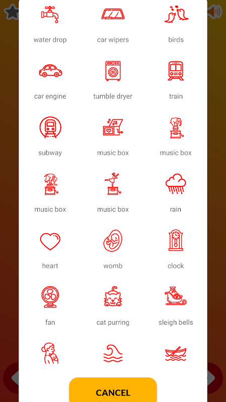 ●ไดร์เป่าผม●เสียงเครื่องซักผ้า●เสียงเครื่องดูดฝุ่น●เครื่องยนต์รถ●เสียงธรรมชาติ●รถไฟ●เมโทร●ไดร์เป่าผม●ที่ปัดน้ำฝนรถ●ภูเขา●น้ำหยด●กล่องดนตรี (เพลงกล่อมเด็ก) ●ฝักบัว●การเต้นของหัวใจ