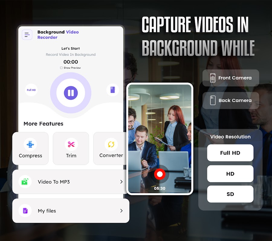 🎥 เครื่องบันทึกวิดีโอพื้นหลังเป็นแอปบันทึกวิดีโอที่ทรงพลังและรอบคอบซึ่งช่วยให้คุณบันทึกวิดีโอแบบเงียบๆ ในพื้นหลังได้ แม้ว่าหน้าจอจะปิดหรือล็อกอยู่ก็ตาม เหมาะอย่างยิ่งสำหรับการใช้กล้องแอบถ่าย การติดตามความปลอดภัย หรือการบันทึกช่วงเวลาต่างๆ แบบแฮนด์ฟรี