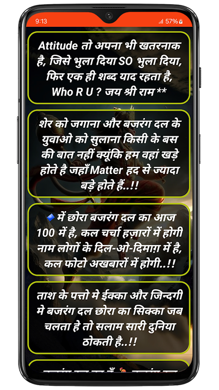อินเทอร์เฟซที่ใช้งานง่ายมากเพียงปัดขึ้นลงเพื่ออ่านสถานะทัศนคติ Bajrang Dal สดที่ดีที่สุดในภาษาฮินดีและตั้งค่านั้นเป็นสถานะ WhatsApp ภาษาฮินดีของคุณหรือสถานะ FB Bajrang Dal ได้อย่างง่ายดาย