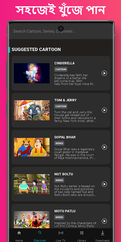 আপনি কি বাংলা কার্টুন ভালোবাসেন? তাহলে আপনি ঠিক জায়গাতে এসেছেন। এই অ্যাপটিতে রয়েছে সমস্ত বাংলা কার্টুন ভিডিও। এছাড়াও রয়েছে বাংলা ডাবিং কার্টুন মুভি ও সিরিজ। এই অ্যাপটিতে কোন ঝামেলা ছাড়াই যেকোন বাংলা কার্টুন দেখতে পারবেন। অ্যাপটিতে কার্টুন সিরিজ গুলোর সম্পূর্ণ এপিসোড স্টেপ বাই স্টেপ পাবেন।