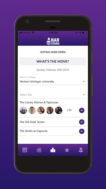 Bar Stars allows college students to skip the hassle of texting all of their friends about which bar they’re going to that night. By sending out a “what’s the bar move” poll around pregame time, our app will allow you to see where all your friends at your university plan on going.