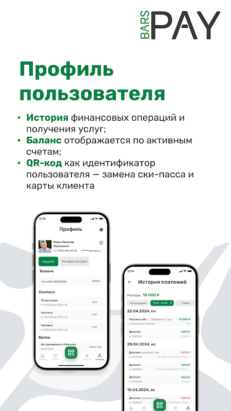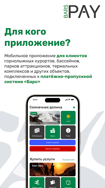 BarsPay 2 เป็นแอปพลิเคชั่นมือถือสำหรับลูกค้าของสกีรีสอร์ท สระว่ายน้ำ สวนสนุก เทอร์มอลคอมเพล็กซ์ และสิ่งอำนวยความสะดวกอื่น ๆ ที่เชื่อมต่อกับระบบ Bars
