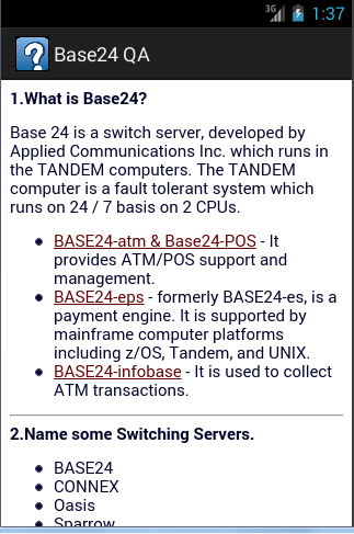 Base24 Tandem QA app contains collection of Questions & Answers in Base24, Pathway, TAL, TACL, COBOL, Enscribe, FUP, SCUP, Spooler, EMS, DDL & SCOBOL, gathered from numerous sources including real interviews.