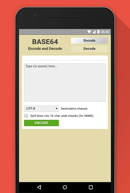 Base64 Encode Decode menyediakan fitur yg berfungsi untuk membuka sandi kata yg ada (Decode)