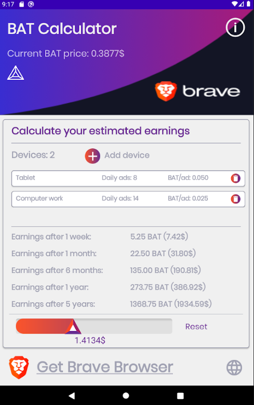 You can calculate your estimated Basic Attention Token (BAT) earnings by adding multiple devices for example your Smartphone and your private computer. The app will give you an overview about the estimated BAT you will earn in the next weeks, months or even years. So lets have a look at this interesting numbers which are often underestimated!