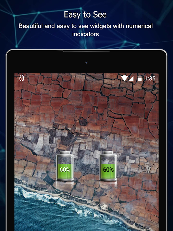 Choose from 6 Live Battery Widget styles that show the exact battery level percentage in a 1x1, 1x2, 2x1, or 2x2 space that also provide battery charging information, battery time remaining, battery temperature, apps running and boosts your battery life by monitoring apps draining battery and recommends better apps.