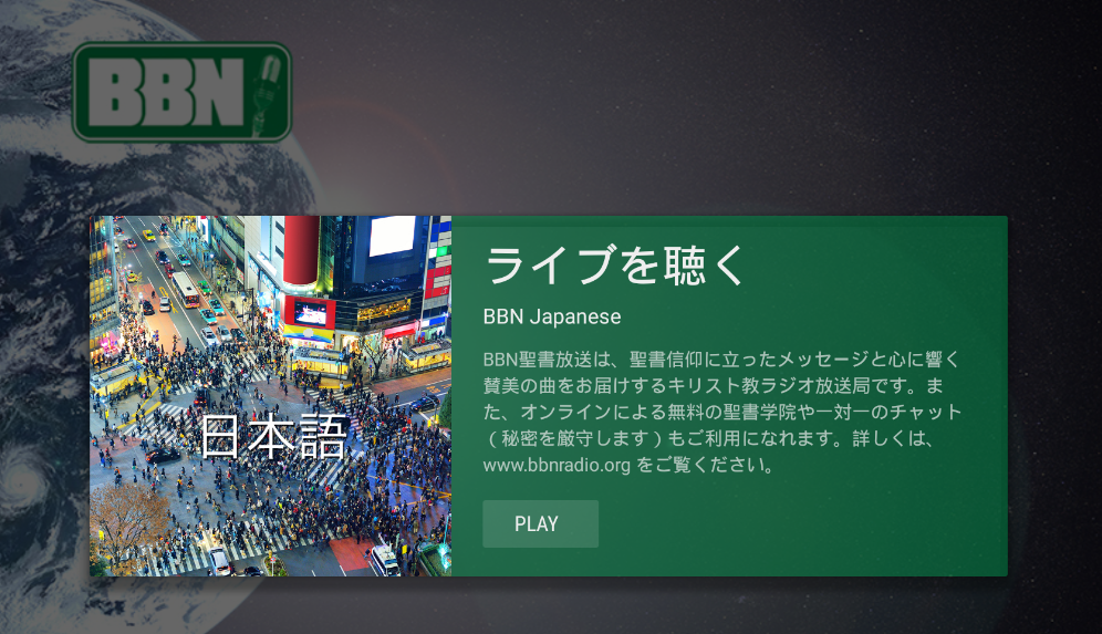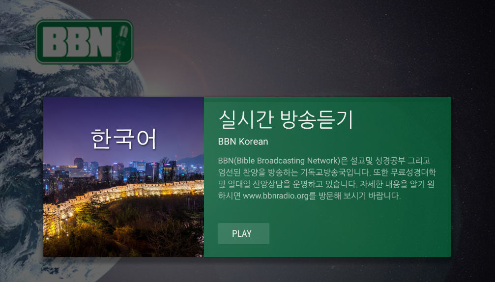 นี้เป็น app BBN สำหรับทีวี พระคัมภีร์ดาวเทียมเครือข่ายเป็นผู้ฟังที่ได้รับการสนับสนุนกระทรวงวิทยุคริสเตียน การเขียนโปรแกรมรวมถึงการเรียนการสอนในพระคัมภีร์เพลงศักดิ์สิทธิ์ดั้งเดิม devotionals และโปรแกรมสำหรับเด็ก BBN ปัจจุบันลำธาร 24/7/365 ใน 8 ภาษารวมทั้งภาษา: อังกฤษ, สเปน, โปรตุเกส, จีน, ญี่ปุ่น, เกาหลี, เยอรมันและรัสเซีย BBN มีสถาบันพระคัมภีร์ออนไลน์ฟรีและเป็นความลับหนึ่งในหนึ่งการพูดคุย สำหรับข้อมูลเพิ่มเติมกรุณาเยี่ยมชมเราได้ที่: www.bbnradio.org