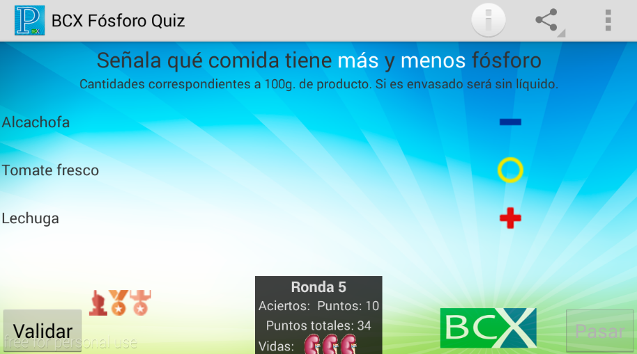 BCX Fósforo Quiz es una aplicación pensada para los pacientes enfermos del riñón, para que aprendan a saber distinguir qué alimentos contienen más o menos fósforo.