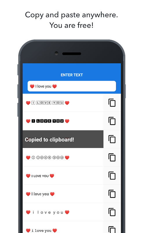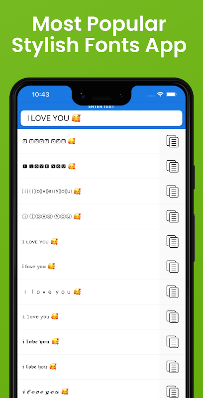 ด้วยอินเทอร์เฟซที่รวดเร็วและใช้งานง่ายของเรา คุณสามารถทำให้ข้อความของคุณมีชีวิตชีวาได้ด้วยการแตะเพียงไม่กี่ครั้ง ก้าวข้ามขอบเขตจินตนาการของคุณ สร้างโพสต์ที่น่าประทับใจซึ่งได้รับไลค์และความคิดเห็นบนโซเชียลมีเดีย ไม่ว่าจะเพื่อการทำงานหรือเพื่อความบันเทิง เครื่องสร้างฟอนต์แฟนซีก็พร้อมที่จะทำให้คุณและข้อความของคุณโดดเด่น