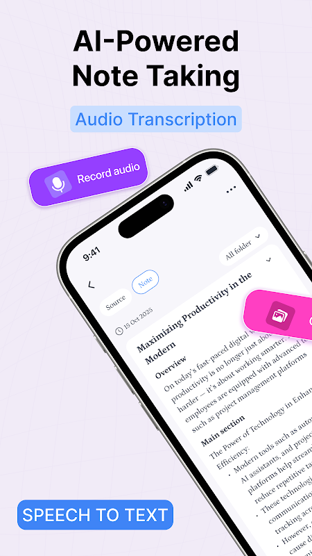 🎙️ ถอดเสียงพูดเป็นข้อความแบบเรียลไทม์ บันทึกการบรรยาย การประชุม หรือบันทึกเสียงได้โดยตรงในแอป AI ขั้นสูงของเราจะถอดเสียงเป็นข้อความแบบเรียลไทม์ พร้อมสร้างสรุปบันทึกพร้อมประเด็นสำคัญให้โดยอัตโนมัติ เหมาะอย่างยิ่งสำหรับ "บันทึกการประชุม" และการเรียนในห้องเรียน
