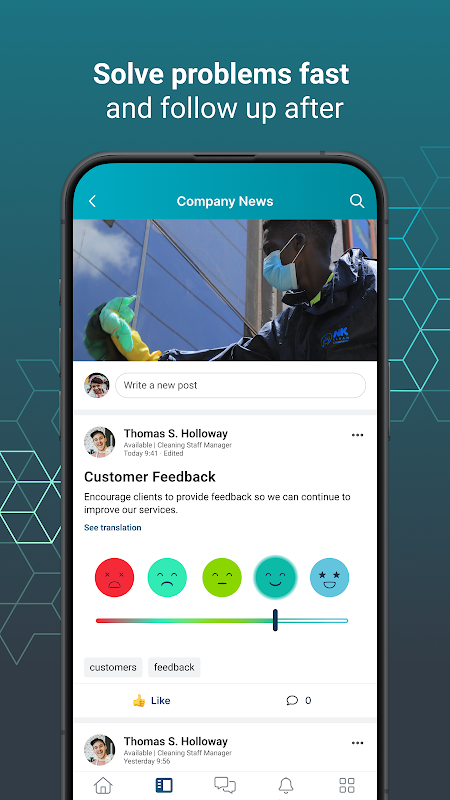 · การสื่อสารและการทำงานร่วมกันแบบเรียลไทม์ - ใช้การแชท สตรีม แบบสำรวจ โพล และแคมเปญที่ปิดวงจรกับแนวหน้าของคุณ การสื่อสารเกิดขึ้นแบบเรียลไทม์ และการทำงานร่วมกันข้ามทีมสามารถเกิดขึ้นได้ทุกที่ทุกเวลาด้วยการแปลแบบอินไลน์ ใหม่! ตอนนี้แอปของเรารองรับการโทรด้วยเสียงและวิดีโอ