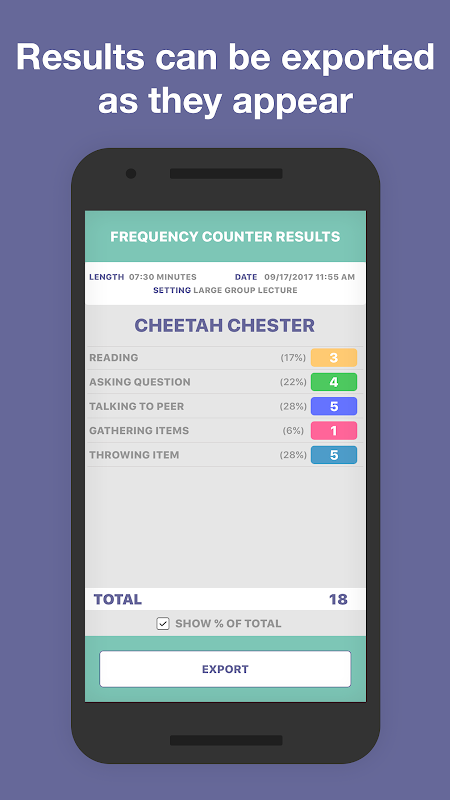 •ผลลัพธ์จะปรากฏขึ้นเมื่อสิ้นสุดเซสชันการสังเกต สามารถส่งออกเป็นตารางกราฟแท่งหรือเป็นไฟล์ CSV (เช่น Excel / Numbers) เพื่อการวิเคราะห์
