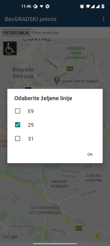 Odabirom ikonice u gornjem levom uglu mape, prikazuju se samo vozila koja sadrže funkcionalnu rampu za pristup ไม่ถูกต้อง kolica Takođe, odabirom nekog od prikazanih vozila na mapi otvara se balončić sa opisom tipa vozila (npr. autobus, zglobni autobus, trolejbus...), nazivom linije na kojoj vozilo saobraćne หมู่บ้าน