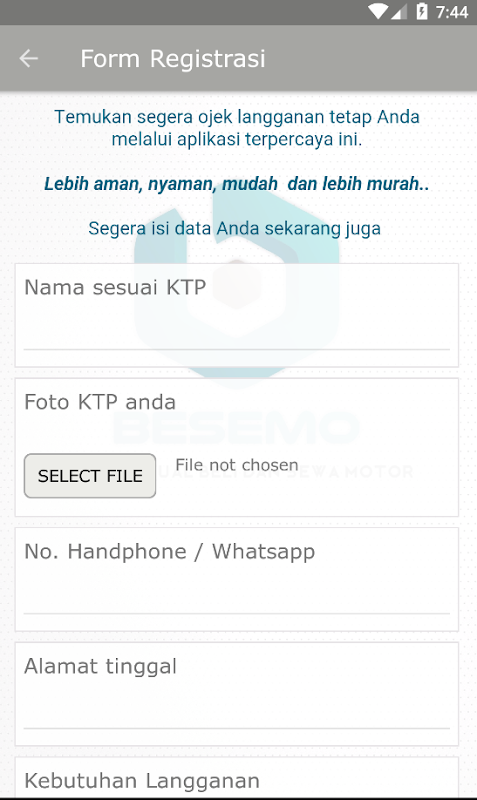 Besemo is a service provider application in selling motorcycle, motorcycle rental and ojek subscription. Facilitate easily both personal and company to transact buying and selling new and old motorcycles. there is also a motor rental service which gives new conveniences for both tourists and locals when need high and fast mobility with small transportation and or directly meet the owner of motorcycle or taxi services with customers for reguler customers such as picking up and dropping to work, school for children and others. Accompanied by easy of transactions safely.