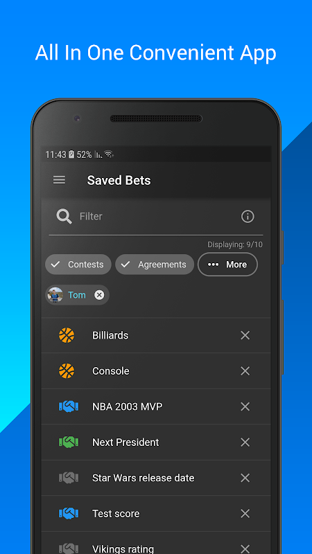 Add your friends to create bets with them and receive notifications about updates.