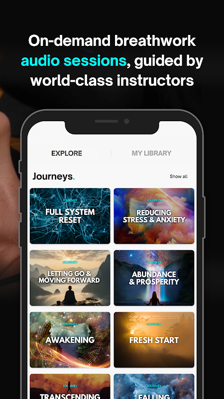 เข้าถึงสภาวะจิตใจและอารมณ์ที่ดีขึ้นภายในไม่กี่นาทีผ่านเซสชันเสียงการหายใจพร้อมคำแนะนำของเราที่ผสมผสานเทคนิคการหายใจตามหลักวิทยาศาสตร์เข้ากับภาพเสียง 9 มิติที่ดื่มด่ำซึ่งสนับสนุนการเปลี่ยนแปลง การเยียวยา และการแสดง!