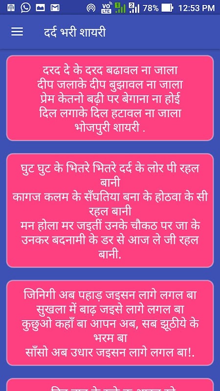 Bhojpuri language is speaking in Bihar, Uttar Pradesh mostly. But now it is world wide famous. In this Application you can read, copy and share on WhatsApp, Facebook and other social site. You will find Bhojpuri Jokes, Bhojpuri Love Shayari, Propose Shayari, Bhojpuri Sad Shayari, Bhojpuri Romance Shayari, Bhojpuri Miss You Shayari, and much more. These Bhojpuri new shayari and jokes topics are much in trending in these days. This App is easy to use and night weight. Below 10 MB. Attractive user interface. You can copy and share it on WhatsApp, Facebook and other social site or Apps.