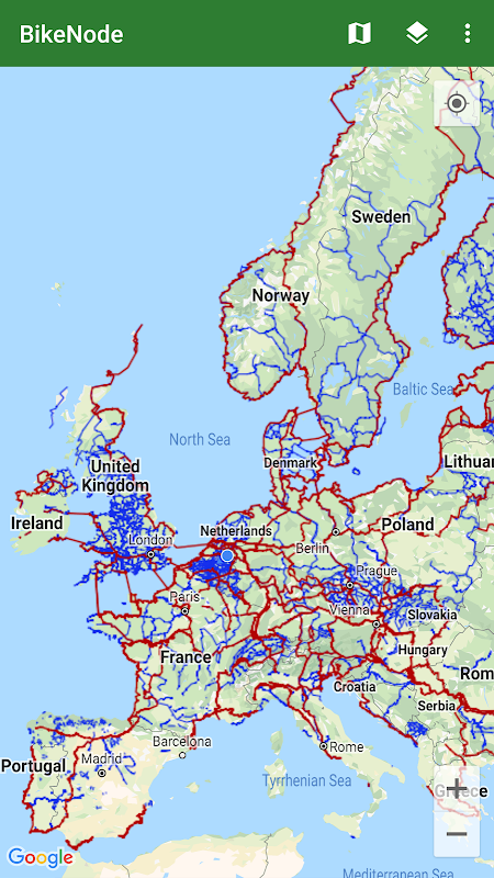 BikeNode แสดงเส้นทางการขี่จักรยานบนแผนที่ทั่วโลก นักปั่นจักรยานสามารถสลับไปมาระหว่างเส้นทางถนนและเส้นทาง MTB เครือข่ายการขี่จักรยานต่อไปนี้จะแสดง: