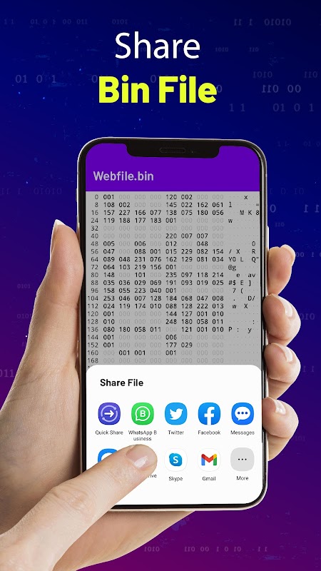 คุณจะเลือกไฟล์จากอุปกรณ์ของคุณและแสดงรหัสไบนารีของไฟล์ในรูปแบบทศนิยมและเลขฐานสิบหก โปรแกรมดูไฟล์ bin และแอพเปิดไฟล์นี้มีอินเทอร์เฟซที่ใช้งานง่ายซึ่งช่วยให้ผู้ใช้สามารถเรียกดูไฟล์ bin จากโฟลเดอร์ที่เลือกและแยกหรือดูเนื้อหาในรูปแบบไบนารี