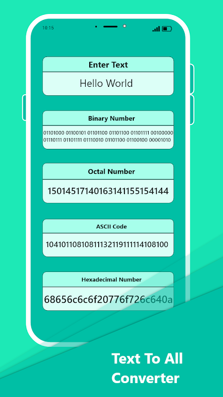 ตัวแปลงช่องจะแปลข้อความเป็นเลขฐานสองทั้งหมด ป้อนเลขฐานสิบลงในแอพไบนารีและแปลงเลขฐานสิบเหล่านั้นเป็นเลขฐานสอง เลขฐานแปด และเลขฐานสิบหก แอพตัวแปลไบนารีเสนอโอกาสในการแลกเปลี่ยนเลขฐานสิบในรูปแบบต่างๆ รวมถึงทศนิยมเป็นไบนารี ทศนิยมเป็นฐานแปด ทศนิยมเป็นเลขฐานสิบหกและเลขฐานสิบหก