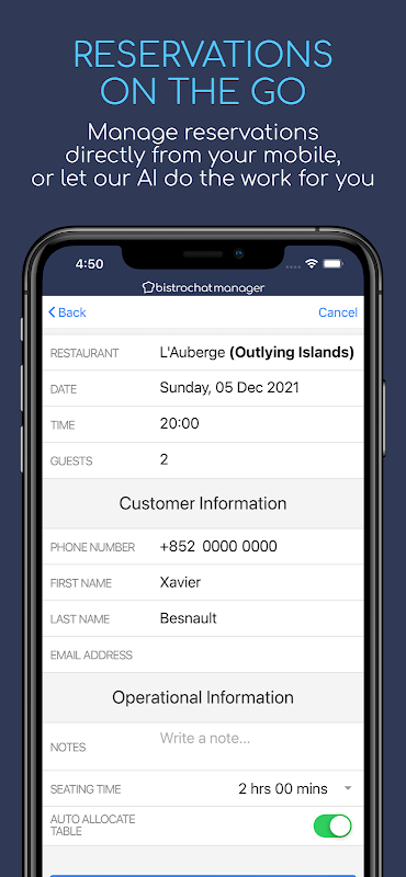 สนทนาทันทีกับลูกค้าร้านอาหารของคุณและรับการจอง 10 วินาทีสำหรับการจอง ไม่ต้องขอให้สะกดชื่อ หมายเลขโทรศัพท์ ทั้งหมดอยู่ที่นี่แล้ว