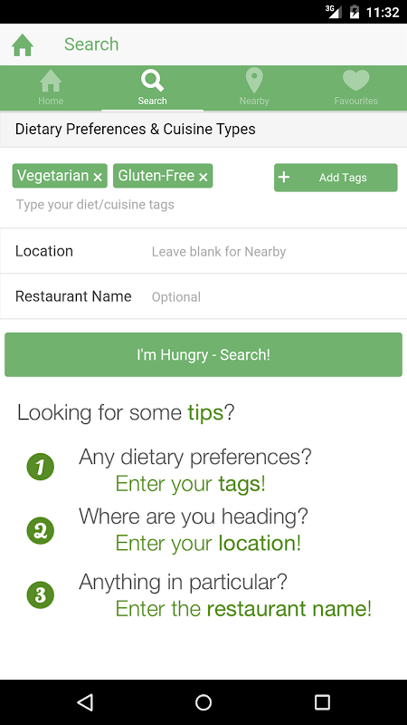 2) Users select their specific dietary and cuisine criteria and then search for suitable restaurants in their vicinity, wherever they are in the world.