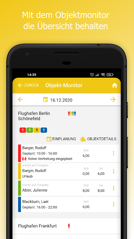 สามารถใช้แอปเพื่อเปรียบเทียบเวลาจริงกับเวลาเป้าหมายหรือเพิ่มด้วยตนเอง การตรวจสอบพนักงานจะแสดงเวลาที่ขาดหายไปตลอดเวลา